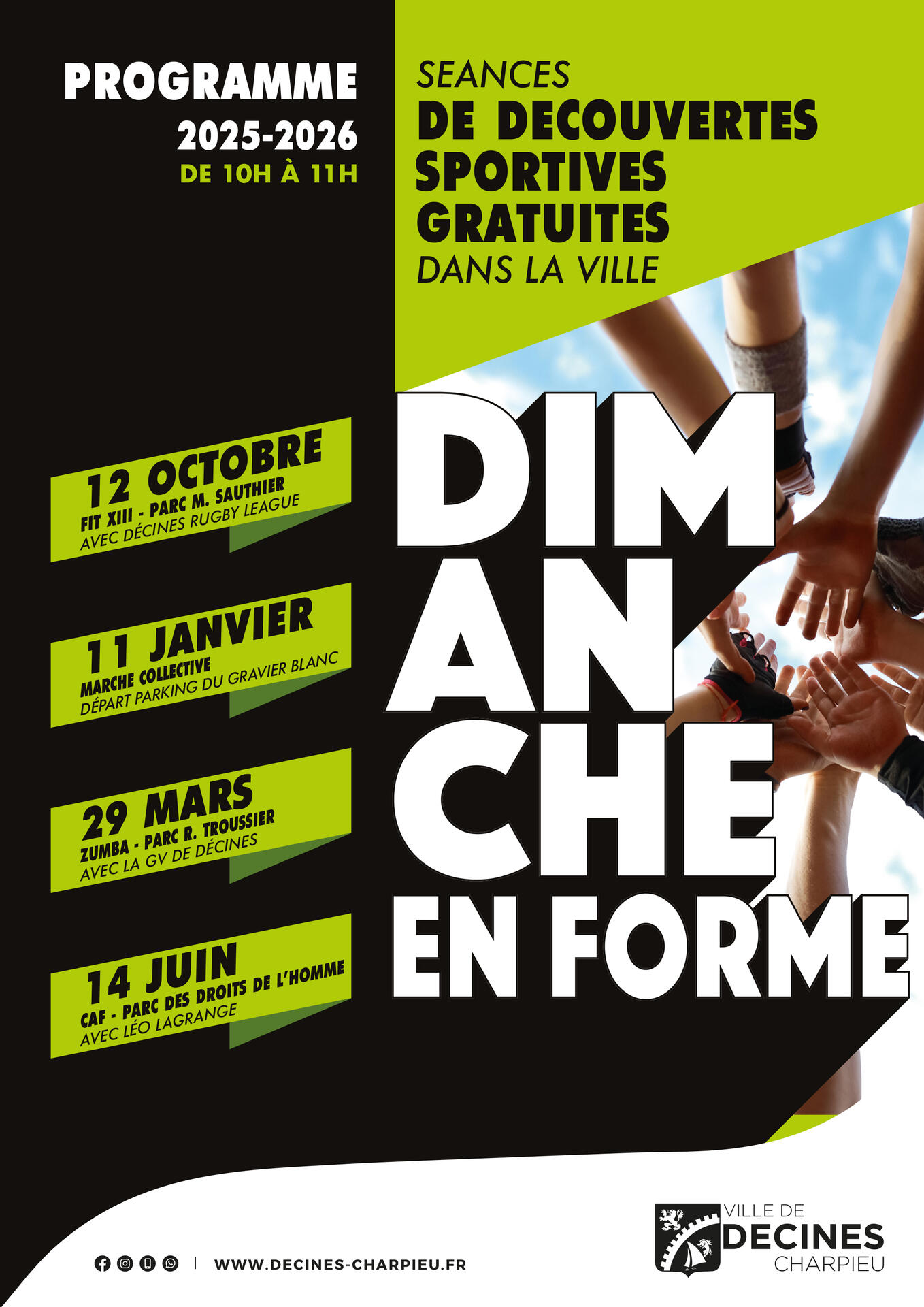 Venez participer à des activités sportives de bien-être organisées par la Ville de Décines-Charpieu les dimanches de 10h à 11h ! Les séances sont gratuites et ouvertes à tous les Décinois à partir de 16 ans. Encadrement par des professeurs diplômés du service des sports ou d’associations décinoises.