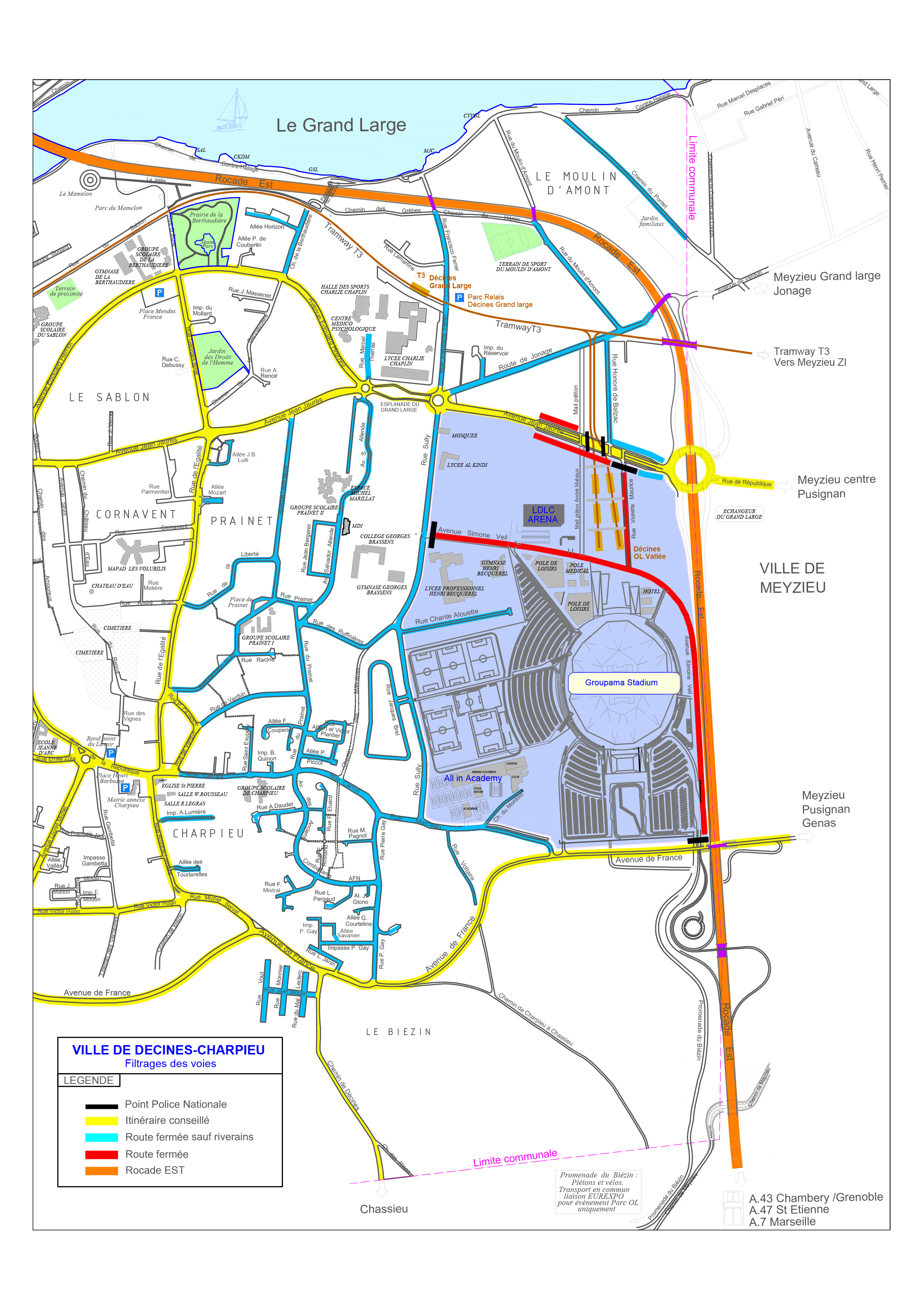 Ces événements font rayonner Décines-Charpieu dans l’Est lyonnais. Ils attirent cependant de nombreux spectateurs qui peuvent perturber la tranquillité des Décinois, en particulier des riverains du Groupama Stadium. Afin de compenser les nuisances, liées principalement aux déplacements et stationnements, la municipalité a instauré la résidentialisation, en lien avec les institutions telles que la Métropole ou les services de la préfecture. Ce dispositif de filtrage limite l’accès des véhicules dans les zones d’habitation autour du stade grâce à un système de barrièrage tenu par des agents de sécurité missionnés par l’Olympique Lyonnais : seuls les riverains, professionnels, associations, etc. exerçant sur le territoire peuvent y pénétrer sur présentation d’un pass délivré par la Police municipale.