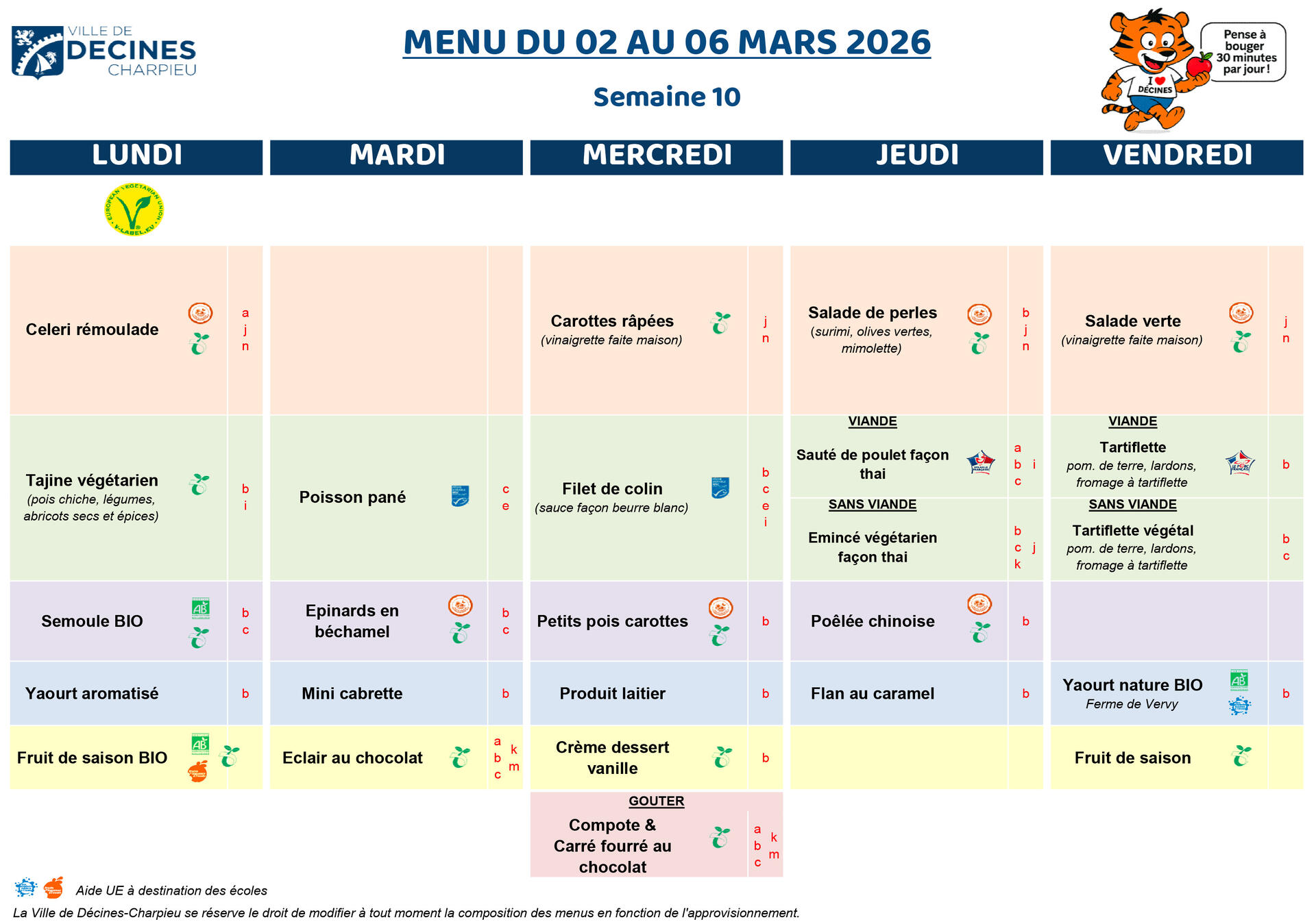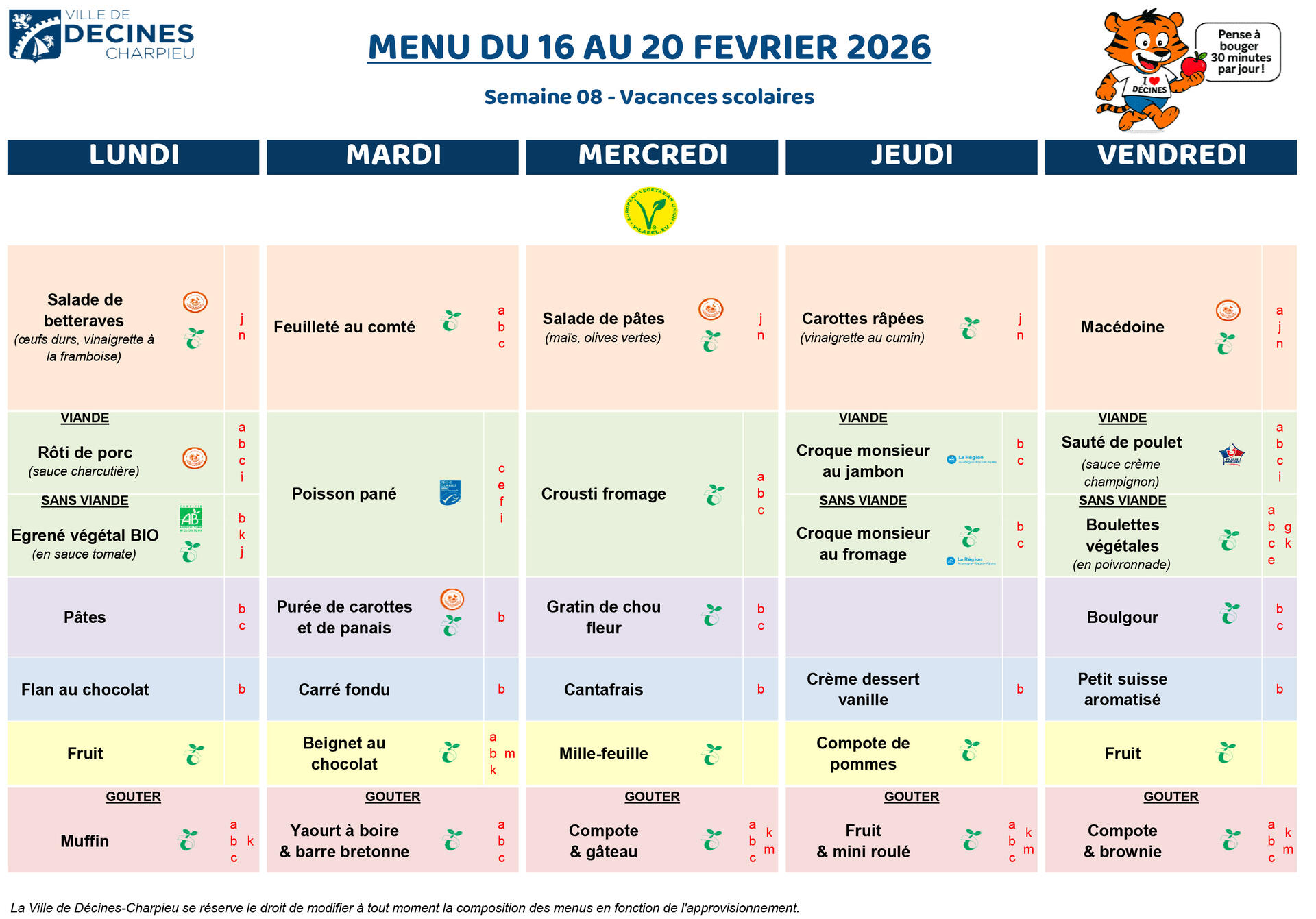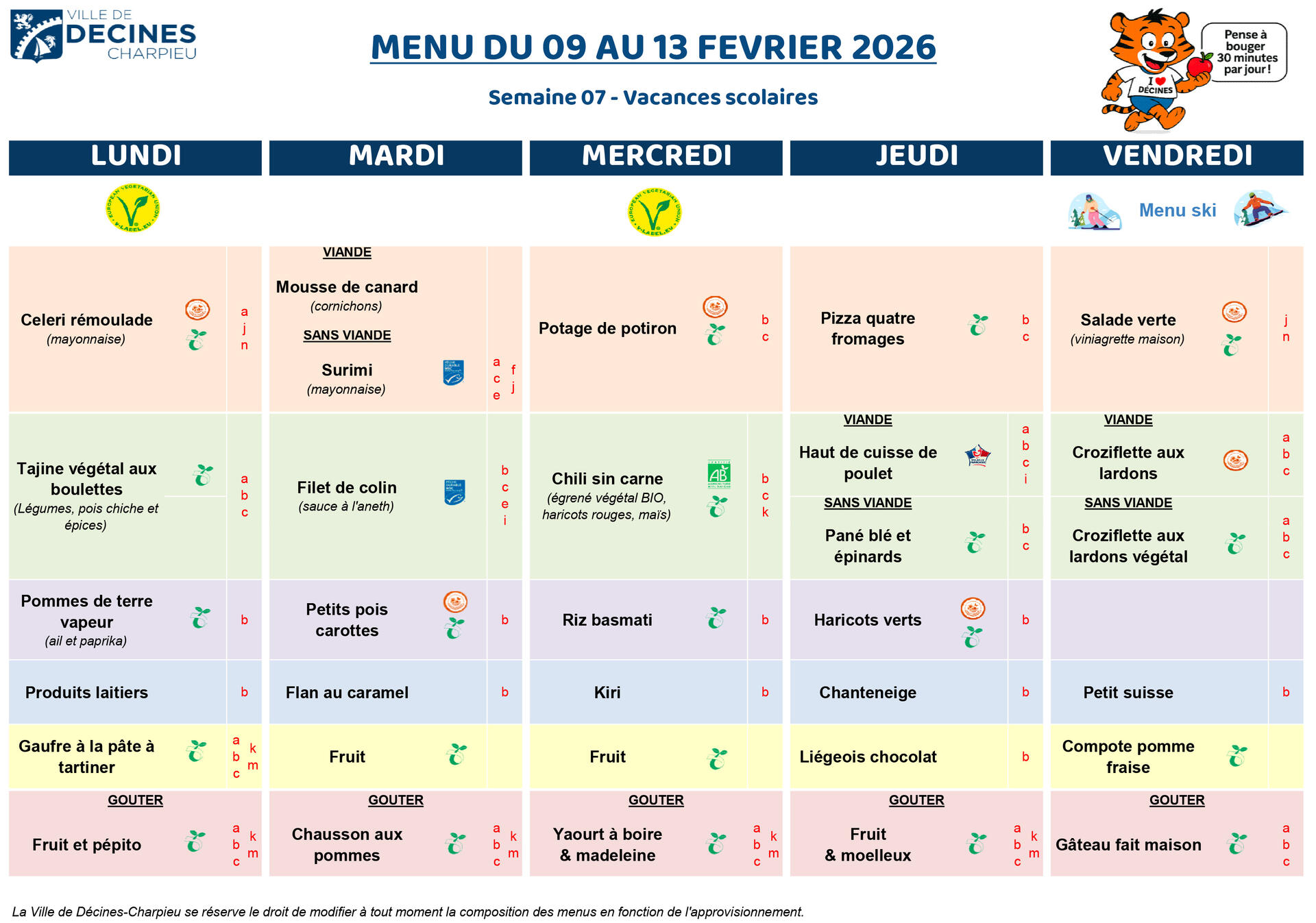 Dans les menus, les lettres entre parenthèses correspondent aux allergènes. Se reporter au tableau en bas de page.