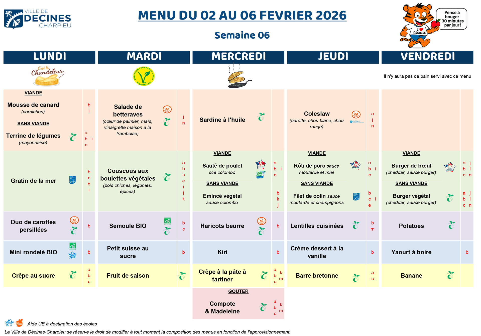 Note du responsable de la restauration municipale : en raison des contraintes liées aux approvisionnements de produits alimentaires, la cuisine centrale peut être amenée à modifier les menus.