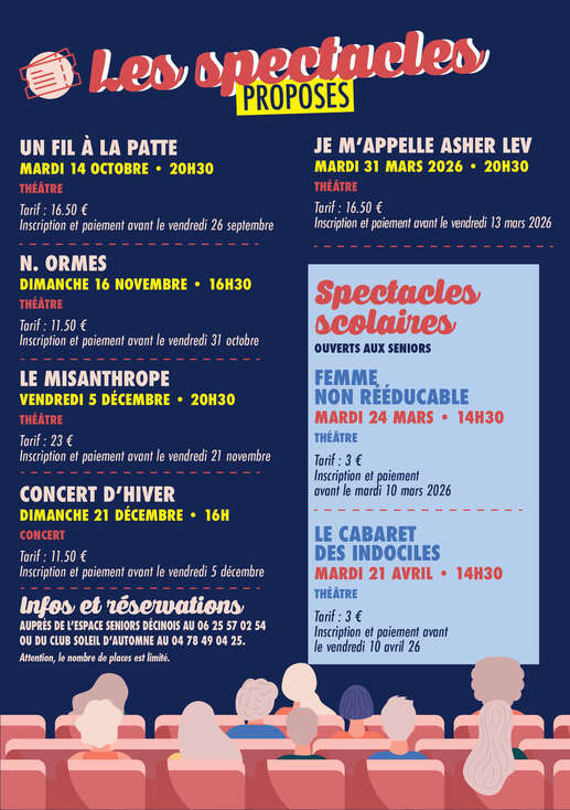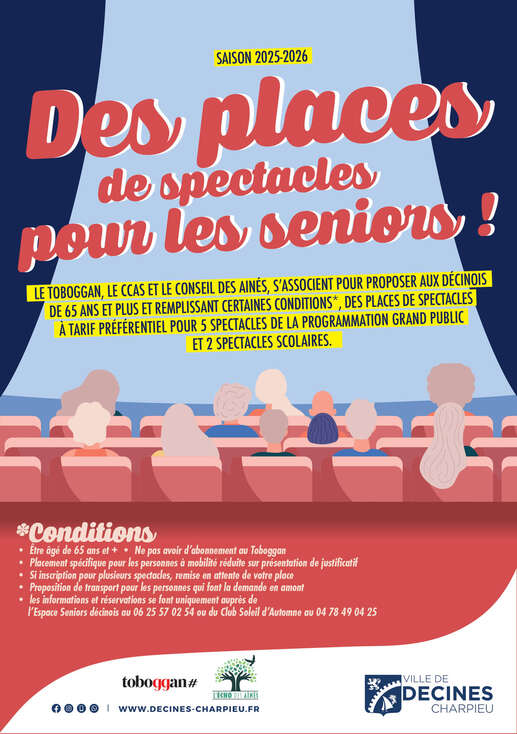 Le CCAS, le Conseil des Aînés et Le Toboggan renouvellent l'expérience à nouveau cette année : proposer aux Décinois de 65 ans et plus des places de spectacles à prix préférentiel. L'objectif ? Faciliter l’accès à la culture et partager des moments conviviaux